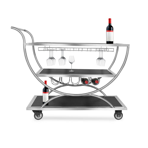 The Cartwheel Pram Service Cart, multi purpose, rollout, 49"L x 22"D x 34"H, heavy duty, 3-tier, includes (3) shelves: (1) 41-3/16" x 20", (1) 33-3/8" x 18", & (1) 41-3/16" x 20", 5-bottle wine rack, 50-cup glass rack, wood shelves with stainless steel frame, reversible shelves to black or walnut finish, curve trim, handles, locking casters