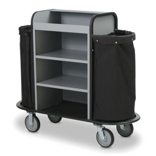 Alumunique Guest Room Attendant Cart, 30"W x 20"D x 43"H cabinet, (3) shelves, 6-1/2" deep top tray, curved privacy panel, low-profile rounded handles and end platforms, full wrap-around vinyl bumper, 8" black wheels, aluminum construction