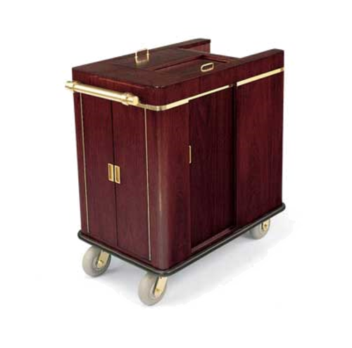 Guest Room Attendant Cart, furniture-style, wood veneer finish, main cabinet, (1) adjustable shelf for small plastic trash can (included), sliding door, (2) sliding lids, (2) shelves enclosed end with (2) doors, open end holds upright vacuum, solid brass handle, full wrap-around vinyl bumper, brass plated casters, 6" dia. grey cushion wheels