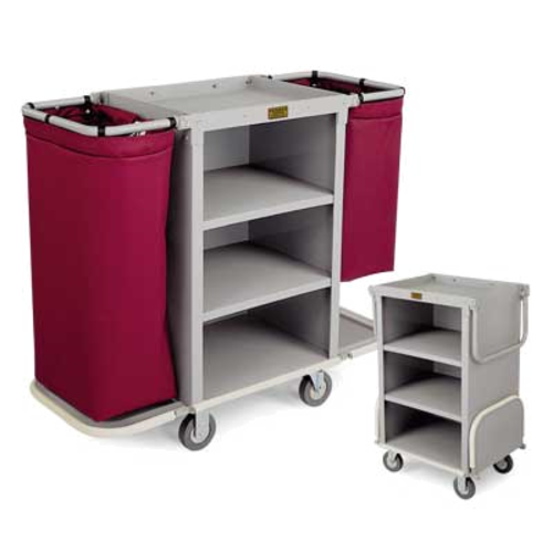 Compact Plastic Housekeeping Cart, three shelves in a 24" W x 19" D x 36" H cabinet with 2" deep top tray, folding low-profile handles & end platforms, full wrap-around vinyl bumper, 5" gray wheels
