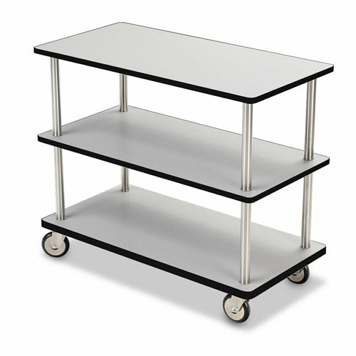Express Service Cart, 36"L x 18"W x 31"H, with high pressure laminate finish (specify color), (3) shelves, black T-mold edges, brushed stainless steel support posts, (4) 4" swivel wheels in chrome plated side plates (this model is available through our Quick Ship program and usually ships in one week or less - call for availability; ships set-up on a pallet) (replaces 4030)