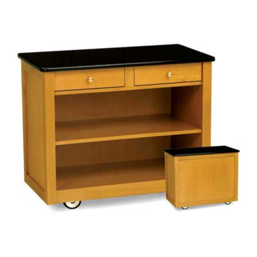 Service Cart, 3-sided wood veneer cabinet, Avonite top, fixed center shelf, (2) drawers, bullnose edge, solid wood molding, 4" dia. black wheels, brass plated casters
