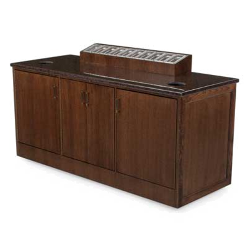 Beverage Cart, wood veneer, solid wood molding, three-section enclosed cabinet, (10) 1/9th pans divided riser (pans not included), Avonite top, trash cutouts, (4) doors, (2) adjustable shelves, partially concealed 5" dia. grey wheels
