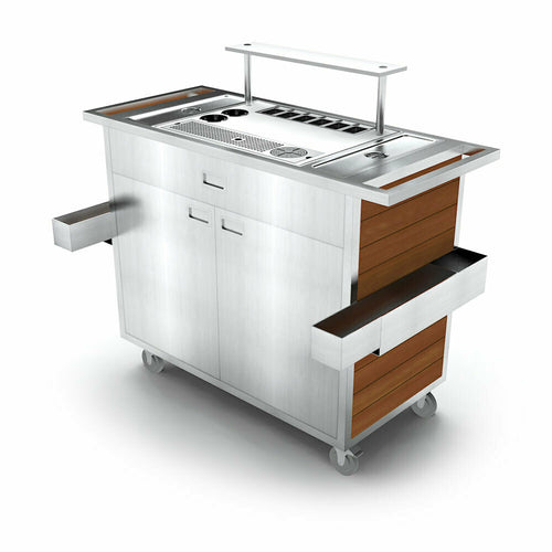 Mixology Cart, Tropical Elite, 58"L x 24"W x 39"H, polyethylene work surface ("C"), tropical hardwood finish, brushed stainless steel tube frame & (2) removable speed rails, push handles, perimeter gallery rails on middle & base shelves, (2) customizable ice compartments, stainless steel drip tray, flip-out amenity drawer, adjustable glass dividers on center shelf, drink presentation platform, built-in condiment station with condiment tray, glass rinser, fully enclosed stainless steel cabinet with (2) pocket doors, built-in Mixology tool storage, 4" dia. rustic look wheels (2 with brakes)