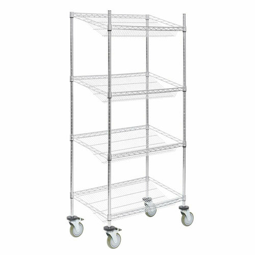 Shelving Unit, wire, mobile, 36"W x 18"D x 69"H, 1000 lb. max capacity, (4) slanted shelves, (4) posts & (4) 5" dia. casters (2 locking), chrome-plated steel, NSF (10 year limited warranty against corrosion & manufacturer defects on shelves)
