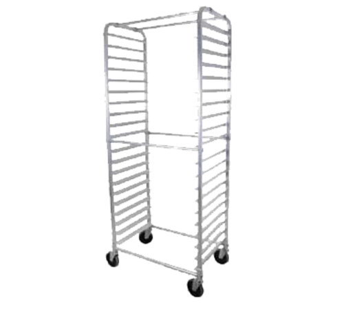 Bun Pan Rack, mobile, (20) pan capacity, 3" spacing, side loading, 28-1/2"W x 18"D x 70"H, 1" square tube frame with bolted cross bracing, 5" swivel casters, 6063 aluminum construction, KD, NSF