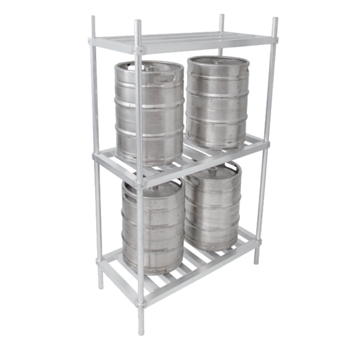 Keg Rack, 60"W x 20"D x 76"H, (3) shelves, accommodates (6) kegs, mid & bottom shelves are constructed of 1-3/4" square tubing running front-to-back with a load rating of 60 lb/ft², top shelf is constructed of 1-3/4" square tubing running left-to-right with a load rating of 15 lb/ft², 1-5/16" dia. post, aluminum construction (Available in Effingham and Nevada)