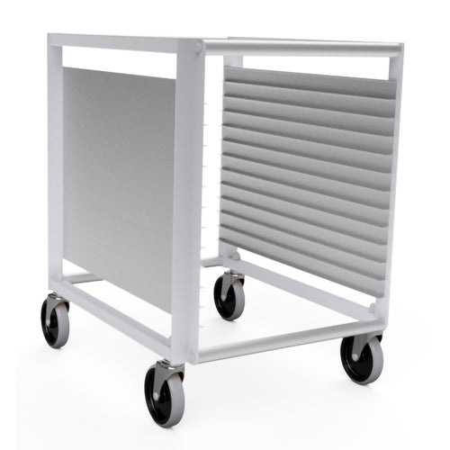 Pan Rack, counter height, interlocking extruded closed sides, with slides for (12) 18" x 26" sheet pans, on 1-1/2" centers, bolted tubular aluminum frame, knock down, end loading, 5" stem casters, ETL