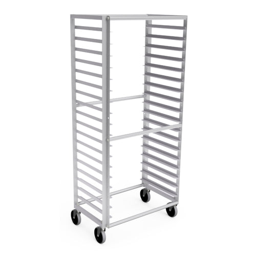 Pan Rack, mobile, open sides, with slides for (18) 18" x 26" pans, slides on 3" centers, bolted angle-type aluminum frame, knock down, side loading, 5" stem casters, ETL