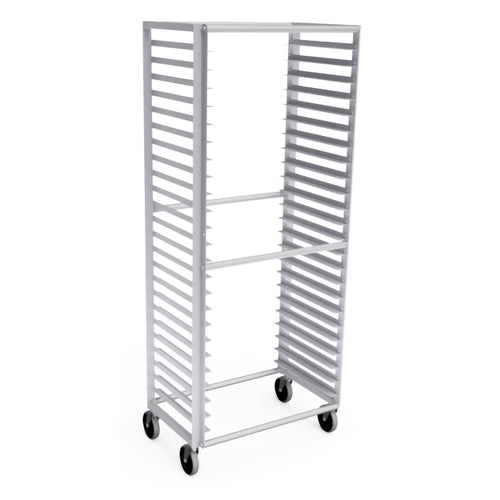 Pan Rack, mobile, full height, open sides, with slides for (24) 18" x 26" pans, slides on 2-1/2" centers, bolted angle-type aluminum frame, knock down, side loading, 5" stem casters, ETL