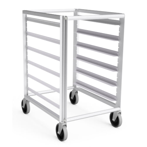 Pan Rack, mobile, open sides, with slides for 18" X 26" pans, (6) pair of removable slides, 4-1/2" spacing, adjustable on 1-1/2" increments, bolted angle-type aluminum frame, end loading, 5" stem casters, ETL