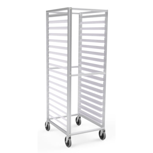 Pan Rack, mobile, 63" height, open sides, with removable runners for 18" x 26" pans, (18) pair of slides adjustable on 1-1/2" centers, bolted angle-type aluminum frame, end loading, 5" stem casters, ETL