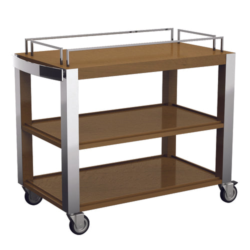 Trolley, 41" x 22-1/2" x 32-3/4"H, rectangular, with (2) under shelves, solid wood, 18/10 stainless steel legs, handle and accents, walnut, (4) casters with non-marking wheels, Dallas