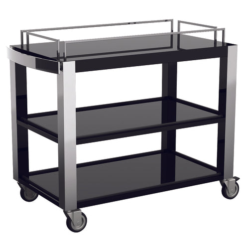 Trolley, 41" x 22-1/2" x 32-3/4"H, rectangular, with (2) under shelves, MDF wood, glossy lacquered laminated panel, 18/10 stainless steel legs, handle and accents, black, (4) casters with non-marking wheels, Dallas Chic