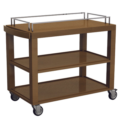 Trolley, 41" x 22-1/2" x 32-3/4"H, rectangular, with (2) under shelves, solid wood, 18/10 stainless steel accents, walnut, (4) casters with non-marking wheels, Dallas VIP