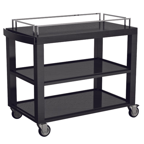 Trolley, 41" x 22-1/2" x 32-3/4"H, rectangular, with (2) under shelves, solid wood, 18/10 stainless steel accents, wenge finish, (4) casters with non-marking wheels, Dallas VIP