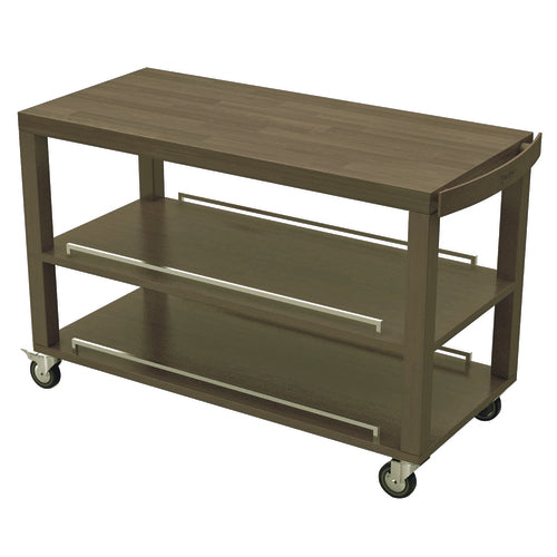 Trolley, 48-3/4" x 22-1/2" x 32-3/4"H, rectangular, with (2) under shelves, solid wood, 18/10 stainless steel handle and accents, walnut, (4) casters with non-marking wheels, Las Vegas VIP