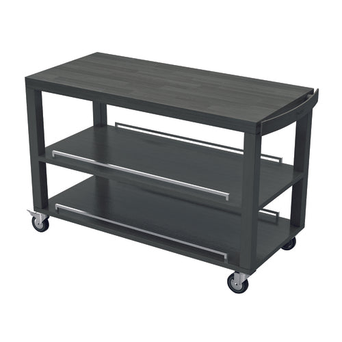 Trolley, 48-3/4" x 22-1/2" x 32-3/4"H, rectangular, with (2) under shelves, solid wood, 18/10 stainless steel handle and accents, wenge finish, (4) casters with non-marking wheels, Las Vegas VIP