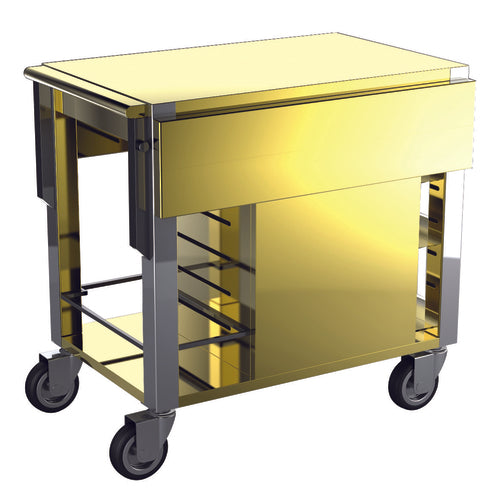 Trolley, 35-7/8" x 31-1/2" x 32-1/4"H, rectangular, includes hot box, MDF wood, glossy lacquered laminated panel, 18/10 stainless steel legs and accents, gold, (4) casters with non-marking wheels, Miami Chic