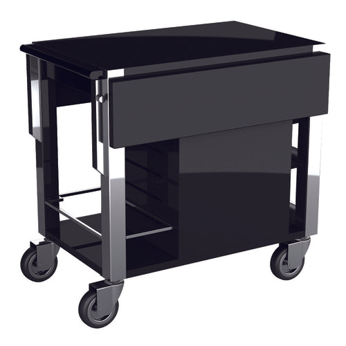 Trolley, 35-7/8" x 31-1/2" x 32-1/4"H, rectangular, includes hot box, MDF wood, glossy lacquered laminated panel, 18/10 stainless steel legs and accents, black, (4) casters with non-marking wheels, Miami Chic