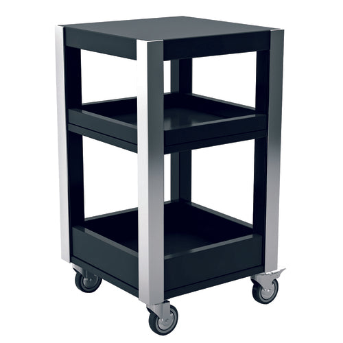 Trolley, 19-3/4" x 19-3/4" x 34-1/4"H, square, with (2) under shelves, MDF wood, glossy lacquered laminated panel, 18/10 stainless steel legs, black, (4) casters with non-marking wheels, Havana Chic