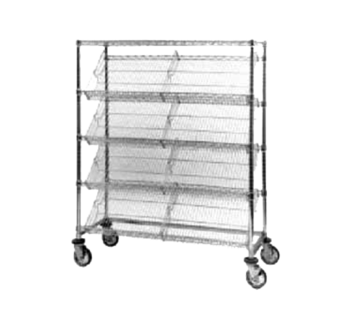 Slanted-Shelf Merchandiser/Dispenser Rack (5) slanted shelves, 48"W x 18"D x 70"H, open wire construction, adjustable 1" intervals, 5" casters brake lock