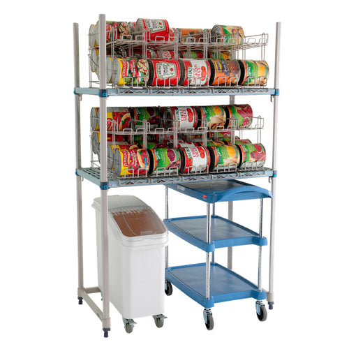 Max Q Can Rack Configuration 24"D x 48"W x 74"H, corrosion resistant, (2) Max Q Shelves, (10) epoxy coated wire can rack accessories, (4) polymer posts, & 3-sided frame for roll under storage capability, accommodates up to (80) #10 cans or (120) #5 cans, NSF