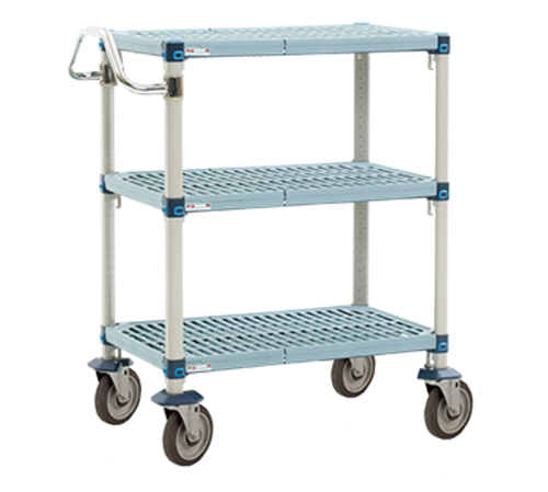 MetroMax® Q Utility Cart, 18"W x 30"D x 40"H, (3) open grid polymer mat shelves, polymer posts, 900 lb. capacity, with Microban® antimicrobial product protection, stainless steel handle (4) swivel rust resistant polymer casters with 5" (127mm) polyurethane wheels, KD, NSF