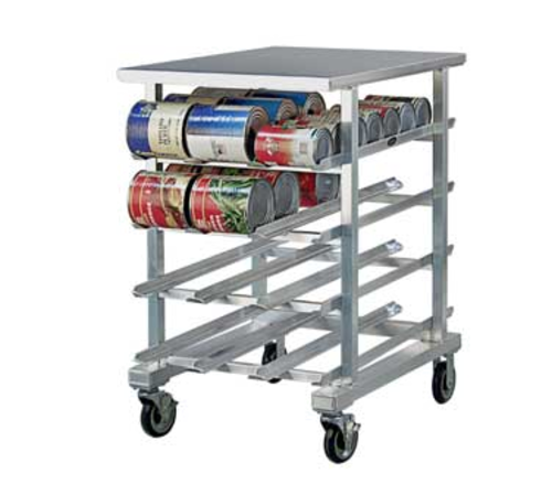 Can Storage Rack, mobile, half-size, aluminum construction with stainless top, sloped glides, accommodates (72) #10 cans or (96) #5 cans, (2) swivel/brake & (2) rigid 5" platform casters, NSF, Made in USA