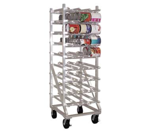 Can Storage Rack, mobile design with casters, sloped glides for automatic can retrieval, aluminum construction, holds (352) #2-1/2 or (484) #303 cans, (4) 6" plate casters, (2) swivel with brakes, (2) rigid, NSF, Made in USA