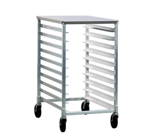 Bun Pan Rack, mobile, half-size, open sides, 10-pan capacity, accommodates 18" x 26", 14" x 18", or 13" x 18" pans, slides on 3" centers, all welded aluminum construction, end loading, stainless steel top, reinforced uprights, (4) 5" stem swivel casters, NSF, Made in USA