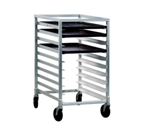 Bun Pan Rack, mobile, half-size, (10) 18" x 26", 14" x 18", or 13" x 18" pan capacity, slides on 3" centers, end loading, open sides, no top, reinforced uprights, all welded aluminum construction, (4) 5" stem swivel casters, NSF, Made in USA
