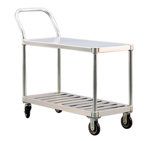 Utility Cart, (1) solid & (1) "T"-bar shelf, open base, shelf size approximately 19" x 48", 800 lbs. capacity, (4) 5" platform casters (2 swivel, 2 rigid) , aluminum tubing frame, NSF, Made in USA
