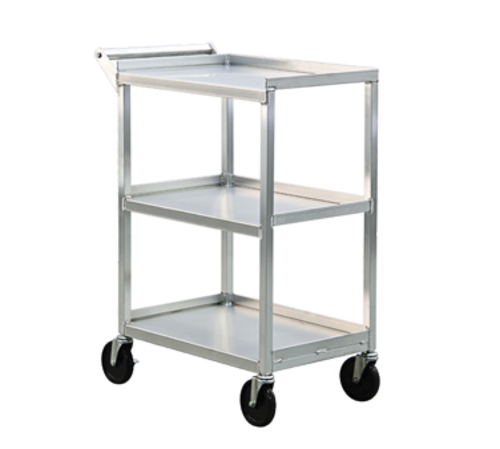 Bussing Cart, open design, (3) solid shelves, shelf size approximately 16-1/2" x 27-3/4", 13" spacing, all welded aluminum construction, aluminum tubular frame with push handle, 350 lbs. capacity, (4) 5" stem casters, (2) swivel & (2) with brakes, NSF, Made in USA