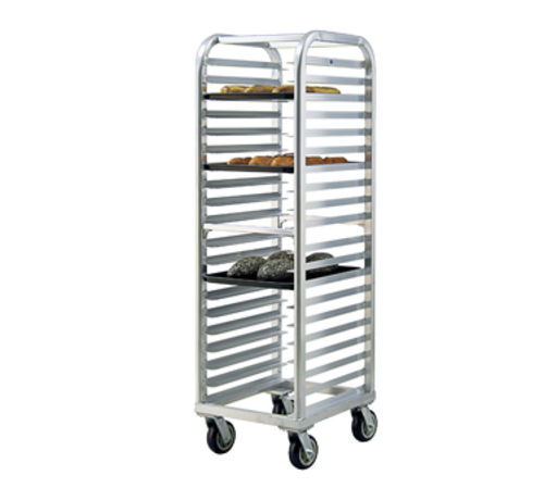Lifetime Series Bun Pan Rack, heavy duty, aluminum, 73"H, (20) angle runners are 1-1/4" x 2" x .100 with 3" spacing (non-adjustable), extruded aluminum guides for 18 x 26 pans, fully welded 1-1/2" x 1-3/4" x .07" smooth wall D-tube uprights, end loading, (4) 6" x 2" platform swivel casters, NSF, Made in USA
