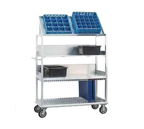 Bussing Station, mobile, 55-1/2"L x 25-3/4"D x 76-1/2"H, 15" shelf clearance, drying rack 1-1/2" angle spacing, accommodates glass racks, bus tubs, 18" x 26" sheet pans, 13" x 18" or 14" x 18" trays, all welded aluminum construction, aluminum tubular frame with push handle, full perimeter bumper, (4) 6" x 2" casters, (2) rigid & (2) swivel, Made in USA (Custom Product, contact factory and details)