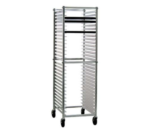 Bun Pan Rack, full height, open sides, with angle guides on 2" centers, capacity 30 - 18" x 26" sheet pans, bolted tubular aluminum frame, knock-down style, end loading, 5" stem type swivel casters, NSF, Made in USA