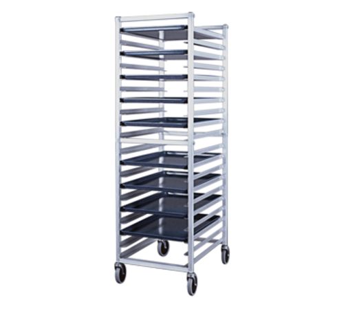Bun Pan Rack, full height, open sides, with angle guides on 3" centers, capacity 20 - 18" x 26" sheet pans, bolted tubular aluminum frame, knock-down style, end loading, 5" stem type swivel casters, NSF, Made in USA