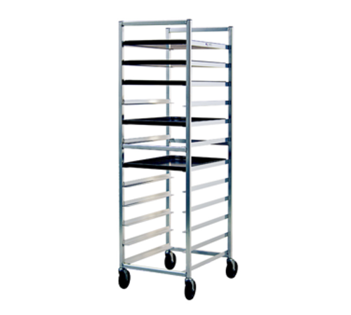 Bun Pan Rack, full height, open sides, with angle guides on 5" centers, capacity 12- 18" x 26" sheet pans, all-welded tubular aluminum frame, end loading, 5" stem type swivel casters, NSF, Made in USA