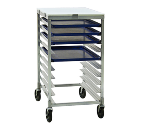 Pan Rack, mobile, 1/2 size height, open sides, 10-pan capacity, accommodates 18" x 26", 14" x 18", or 13" x 18" pans, slides on 3" centers, all welded aluminum construction, end loading, poly top, reinforced uprights, (4) 5" stem swivel casters, NSF, Made in USA