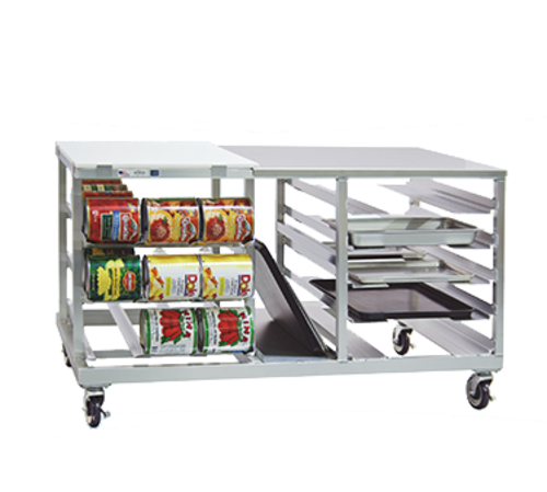 Prep Table, mobile, 60"W x 36"D x 34-9/16"H, five-in-one unit includes: can storage, holds (54) #10 cans and (72) #5 cans, 5/8" thick poly top cutting board, pan storage and universal pan rack with 5" stepped angled runner spacing, and 16 ga. stainless work top, (4) 5" casters, all with brake, Made in USA (Custom Product, contact factory for details)