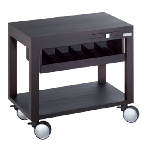 Deluxe Gueridon Trolley, 44 lb. capacity, 33-1/2" x 19-5/8" x 29-1/2", includes: removable upper deck with knob and cutlery shelf, oak finish, 18/10 stainless steel, Sambonet, Tokyo S/S (Special Order Item)
