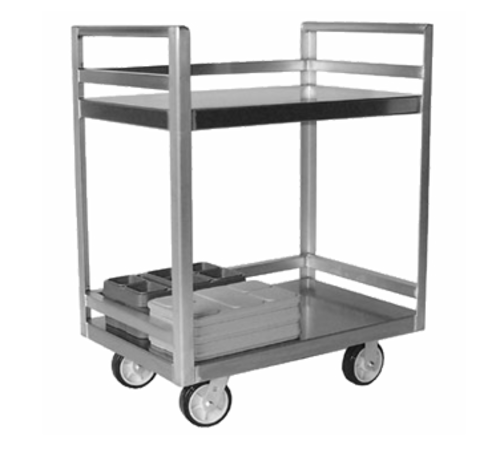 Correctional Tray Delivery Cart, extra heavy duty, (2) shelves, (36) 11" x 16" insulated tray capacity, 1" tubular handle, three sided 1-1/2" square tubing rail, all welded aluminum construction, 6" heavy duty casters (2 swivel, 2 rigid), NSF