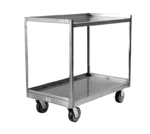 Correctional Tray Delivery Cart, extra heavy duty, (2) shelves, top shelf accommodates 2-3 beverage containers, bottom shelf accommodates (60) 13-7/8" x 15-1/4" insulated tray, 1" tubular handle, three edges up, front down, reinforced with square tubing, heavy duty aluminum angle uprights, all welded aluminum construction, 6" poly casters (2 swivel, 2 rigid)