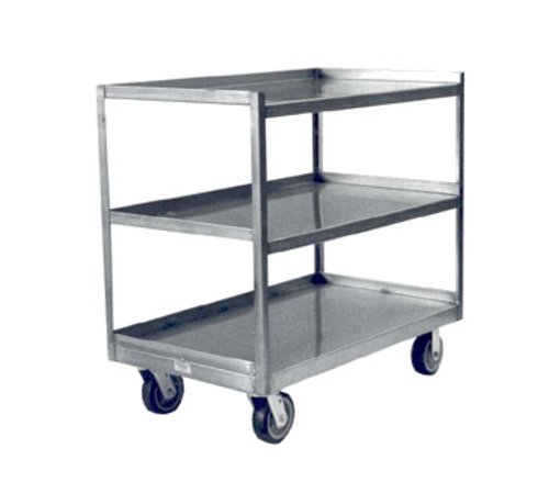 Correctional Utility Cart, heavy duty, (3) solid shelves, open base, shelf size: 24" x 43", 3 edges up & front edge down, 1000 lb. capacity, heavy duty uprites, stainless steel construction, 6" x 2" polyurethane casters (2 swivel, 2 rigid)