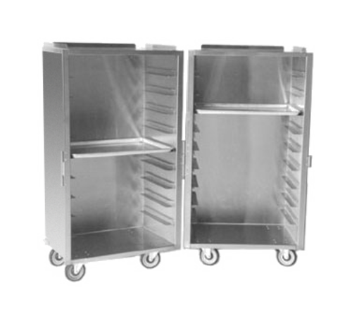 Tray Delivery Cart, dual twin section, clam shell type, 40-1/2" high, (14) 18" x 26" tray capacity, 4-1/2" spacing, channel slides, 2 corner bumpers at back, locking device, can be used individually or as a compact twin-unit, stainless steel locking pins, top with 3 edges, all welded stainless steel construction, 5" casters, NSF