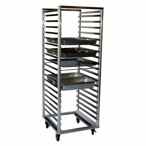 Pan Rack, mobile, standard duty, 57-7/16" high, (16) GN 2/1 pan capacity, 3" spacing, riveted stainless steel channel sides, side loading, aluminum construction, 5" swivel casters, NSF