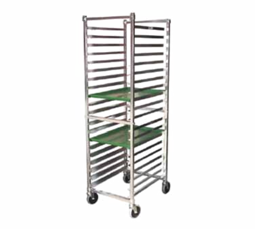 Kelmax Pan Rack, mobile, full height, economy, (12) 18" x 26" pan capacity, slides on 5" centers, end loading, square top, bolted tubular aluminum frame, 5" standard duty casters, KD, NSF