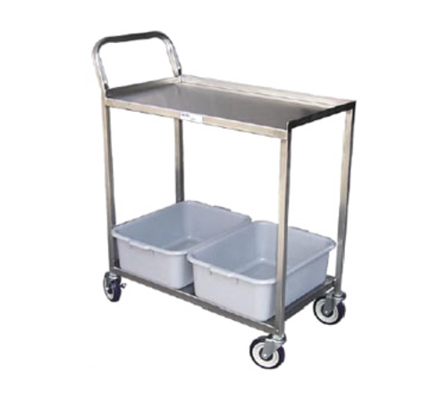 Kelmax Utility Cart, 2-tier, open design, shelves three sides up, one down, shelf size 18" x 32", single handle, all welded aluminum frame, 5" polyurethane swivel stem casters, 650 lb. load capacity, NSF