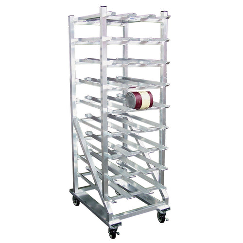 Kelmax Can Storage Rack, stationary design, 4 columns wide, self feeding gravity fed shelves, holds both #10 & #5 cans, all welded extruded aluminum construction, 216 can capacity, NSF